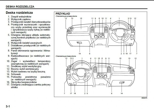 Instrukcja obsługi Suzuki zawiera wszystkie wersje wyposażenia oraz przydatne informacje jak sprawnie i bezpiecznie użytkować pojazd np.-wskaźniki, lampki kontrolne, otwieranie i zamykanie-oświetlenie i widoczność, fotele, schowki, ogrzewanie, wentylacja, klimatyzacja-jazda, wskazówki eksploatacyjne, konserwacja pojazdu-poziomy płynów, sprawdzanie i uzupełnianie, czynności awaryjne, wymiana kół, bezpieczniki, wymiana żarówek-dane techniczne... oraz wiele wiele innych rzeczy, które dają poczucie bezpieczeństwa oraz komfortu podróżującym. Polskie prawo nakłada na sprzedawcę obowiązek dołączania instrukcji obsługi auta w języku polskim do . Instrukcja obsługi auta jest nowa i w języku polskim.
