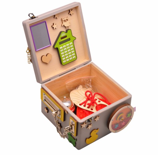 - wyjmowanie poszczególnych elementów z kuferka nauczy dziecko wykonywania precyzyjnych ruchów