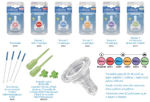 Smoczek Dr Brown′s Preemie zapewnia spójny, naturalny, powolny przepływ. Kształtem przypomina pierś matki. Wykonany z najwyższej jakości super miękkiego silikonu. W połączeniu z systemem antykolkowym powoduje bezciśnieniowe karmienie, które zmniejsza występowanie kolek, odbijania oraz gazów. Smoczek pasuje do wszystkich wąskich butelek Dr Brown′s. W opakowaniu znajdują się 2 smoczki. Można myć w zmywarce na górnej półce. Przeznaczony dla dzieci od pierwszego dnia życia.