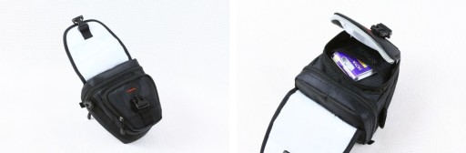 Kabura posiada wkładkę poliuretanową, pozwalające na dowolną konfigurację przestrzeni wewnątrz futerału. Wkładkę możemy dowolnie wpiąć w rzepy umieszczone wewnątrz futerału. Dzięki temu kaburę idealnie dopasujemy zarówno do aparatów z krótkimi obiektywami 18-55mm jak i większymi np. 18-200mm.