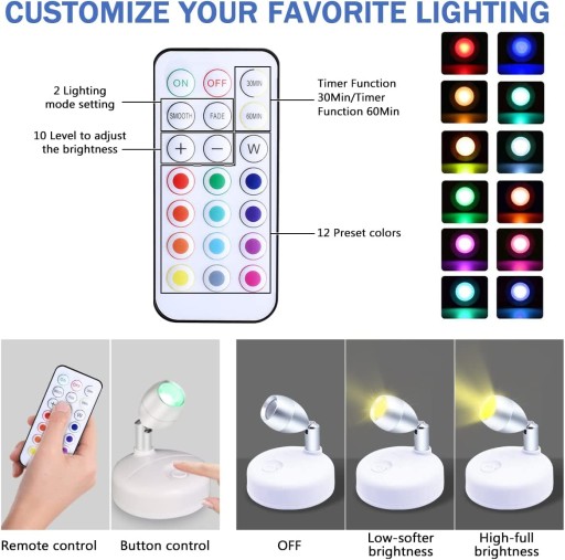 Piękne, kompaktowe, wielokolorowe plamki — to przenośne małe oświetlenie punktowe może rzucać 60 lumenów schludnej białej (5000 K) poświaty, a także 12 innych wstępnie ustawionych kolorów RGB. Idealny do nadawania akcentu Twojemu dziełu sztuki na ścianie lub kryształom na blacie, dekoracjach świątecznych, takich jak Wielkanoc, Halloween, Boże Narodzenie lub w celu ustawienia nastroju podczas grania w gry komputerowe, vlogowania, webcastingu itp. Uwaga: jeden mały reflektor zasilany bateryjnie może nie być nadaje się do dużego obszaru, który wymaga super jasności