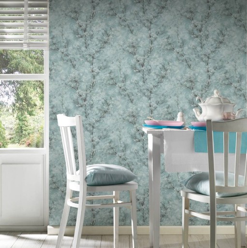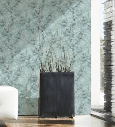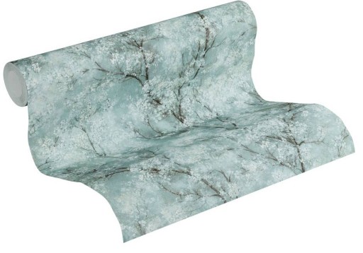 Tapety wyglądają jak piękny obraz kwitnących drzew na zielono-miętowym tle,