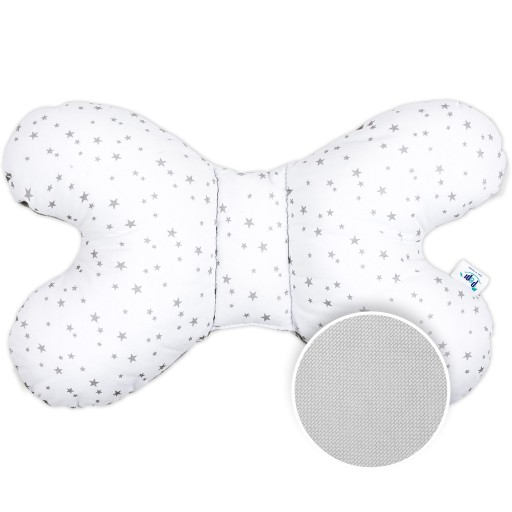 Antywstrząsowa dwustronna poduszka Motylek Pepi z kolekcji GREY GALAXY podtrzymuje główkę dziecka podczas podróży, zapobiega jej niekontrolowanemu kiwaniu się na boki, chroniąc delikatny odcinek szyjny kręgosłupa dziecka.