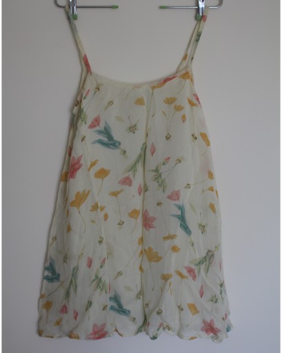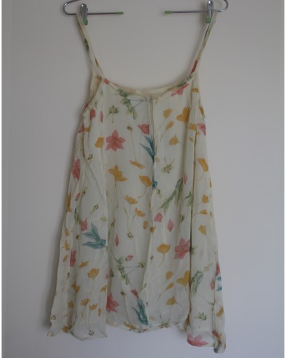 Urocza, letnia sukienka w kolorze ecru z pastelowymi kwiatami. Na ramiączkach. Długość ok 60-63 cm plus ramiączka 16 cm. Rozkloszowana, powiewna. Z tyłu suwak. Podszewka. Używana bardzo mało, wygląda jak nowa.