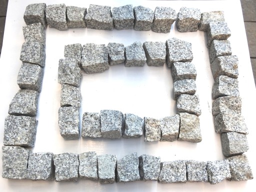 Kostka ma wymiary w przedziale mniej więcej 4/6cm , jest to materiał naturalny, kostki różnią się od siebie kształtem co dodatkowo podkreśla ich naturalne pochodzenie . Z jednego opakowania kostki uzyskamy obrzeże o długości około 3,5mb lub okrąg o średnicy 115cm !
