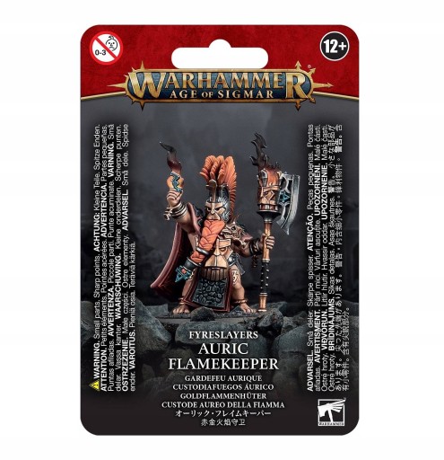 This multipart plastic kit builds one Auric Flamekeeper, a funerary support Hero and Totem for Fyreslayer armies. Garbed in his sacred salamander-skin cloak and stern death mask, this duardin bears aloft the burning Masterflame Rune in one hand and wields a flaming brazier axe in the other. In battle, these warrior-priests wade into combat wherever the fighting is hardest, calling on the ur-gold power harvested from their fallen comrades to activate one of a range of magical effects.