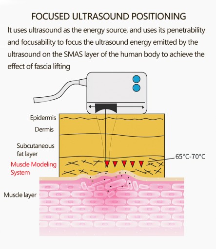 HIFU Theory:Use high energy ultrasound focusing the treatment position, so that the skin tissue create the thermal,and make high-speed friction cells to stimulate collagen. Such heat effect will not hurt the epidermis, because the treatment fast and direct access to the treatment site within 0-0.5 seconds, without touching the surrounding tissue and can be passed directly to the superficial tendon membrane system (SMAS),so it can be done firm skin while pulling the muscle layer, thin face up to the progressive effect.