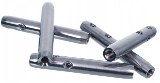 Tuleja z stali nierdzewnej A4 z zaciskiem do liny 5 mm oraz z gwintem lewym M6. Zacisk tego typu znajduje zastosowanie jako napinacz dla lin bądź mocowanie liny do śruby.
