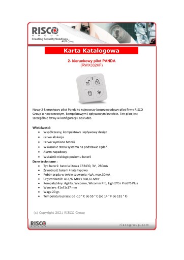 RWX332KF DWUKIERUNKOWY PILOT STEROWANIA PANDA PROSYS LIGHTSYS 2 PLUS RISCO