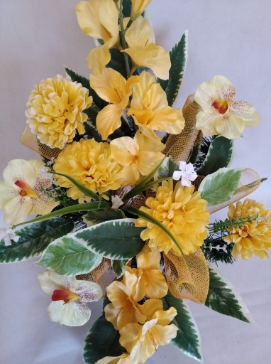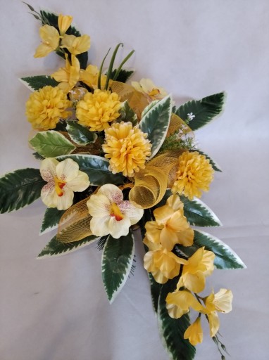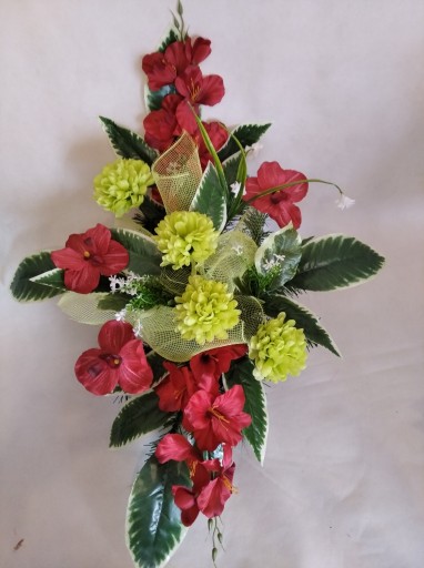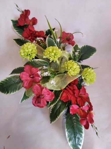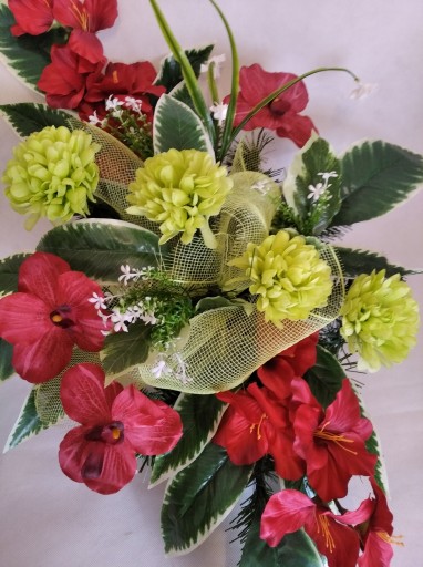 Kompozycja sztuczna (tzw. stroik, ikebana) jest wykonana z sztucznej choiny w doniczce plastikowej co daje jej stabilność.