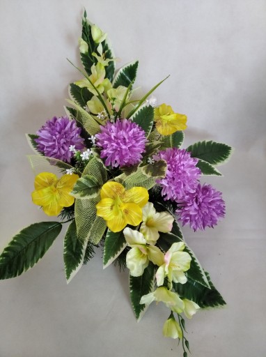 Wykonany na uniwersalnym flakonie plastikowym zabetonowanym z choiną sztuczną, gotowy tylko do włożenie do wazonu! Flakon ma średnice 12 cm od góry i 7 cm od dołu, ma 10 cm wysokości. Kompozycja do wazonu ma ok. 60 cm wysokości i 40 cm szerokości.