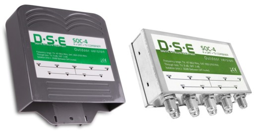 Sumator sygnału satelitarnego i telewizji naziemnej DVB-T2 DSE SOC-104. Urządzenie pozwala zsumować sygnały z konwertera satelitarnego quad i anten naziemnych. Sumuje częstotliwości 950-2150 MHz (satelitarna) z częstotliwościami 47-862 MHz (radiowa i TV naziemna).