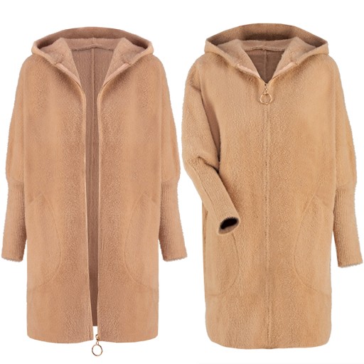Puszysty i wysokogatunkowy płaszcz ALPAKA Z WEŁNĄ, bardzo delikatny i miękki w dotyku. Płaszczyk z kapturem o oversizowym kroju idealnie dopasowuje się do sylwetki.