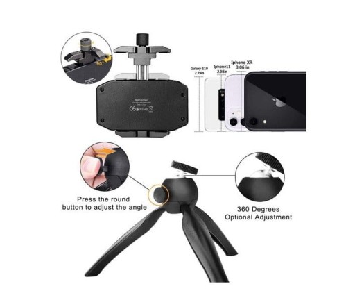 Odbiornik pełni również rolę uchwytu telefonu i istnieje możliwość zamontowania go na dołączonym statywie. Dzięki takiemu rozwiązaniu mikrofon i nadajnik możesz umieścić na nagrywanej osobie a za pomocą odbiornika z podłączonym smartfonem rejestrować jednocześnie film lub fotografować. Zarówno odbiornik jak i nadajnik dysponują ekranem LCD na którym wyświetlane są podstawowe informacje takie jak stan baterii, poziom dźwięku w czasie rzeczywistym, wybór kanału oraz stan wyciszenia.