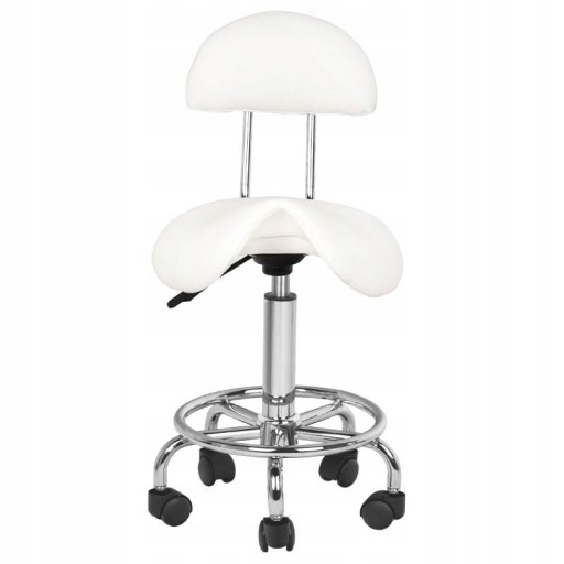 Wygodny, stabilny taboret kosmetyczny z oparciem, z profilowanym siedziskiem, na pięcioramiennej podstawie z plastikowymi kółkami. Dostępny w kolorze BIAŁYM, niezbędny mebel w gabinecie kosmetycznym.
