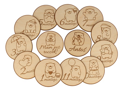 Komplet drewnianych tabliczek do zdjęć dokumentujących pierwsze 12 miesięcy życia. Komplet składa się z 13 tabliczek. 11 z nich poszczególnymi miesiącami, jedna "Mam już roczek" oraz ostatnia z personalizowanym imieniem dziecka.