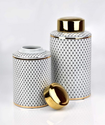 Wazon z pokrywką inspirowany kształtem starożytnej amfory z kolekcji CHARLOTTE GOLD marki MONDEX. Dzięki dekoracyjnej pokrywce możesz w łatwy sposób odmienić wazon w ozdobny pojemnik. Wazon łączy w sobie funkcjonalność i elegancję. Piękne czarne ornamenty w połączeniu ze zlotem i bielą podkreślą piękno każdego wnętrza.