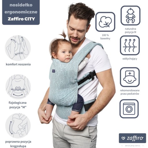 Zaffiro CITY to wysokiej jakości nosidło w przystępnej cenie. Jego główne zalety to niewielki rozmiar oraz waga 0,4 kg dzięki czemu możesz je mieć zawsze przy sobie: w domu, na spacerze, w podróży czy na wakacjach