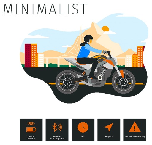 Nawigacja • Ostrzeżenie o prędkości • Czas • DVISION Stan naładowania • Stan połączenia Bluetooth Zakres