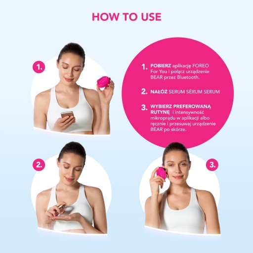 Urządzenie jest odpowiednie dla każdego rodzaju skóry i wieku, zapewniając widoczne, długotrwałe efekty przy konsekwentnym korzystaniu. BEAR™ należy stosować z przewodzącym mikroprąd serum FOREO Serum Serum Serum, aby zapewnić odpowiednie bezpieczeństwo i lepsze efekty.