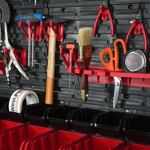 ⭐ Wytrzymałe półki narzędziowe oraz uchwyty pomagają w przechowywaniu dłuższych narzędzi tj. wiertarka, klucze, młotek, kombinerki czy śrubokręty.