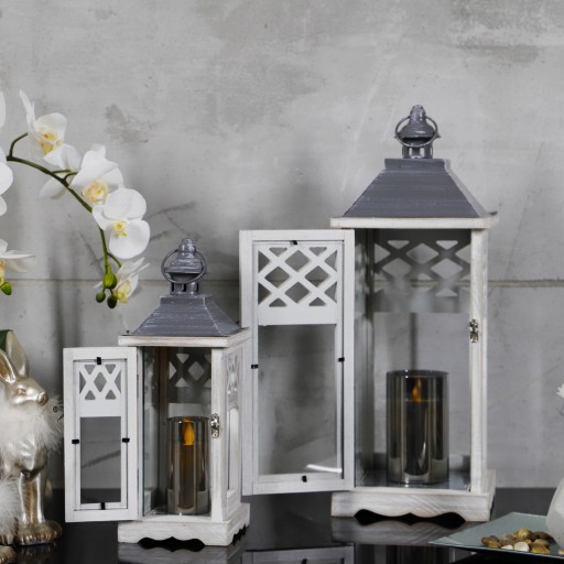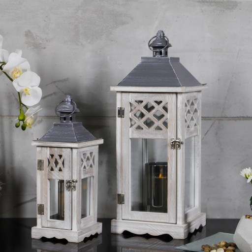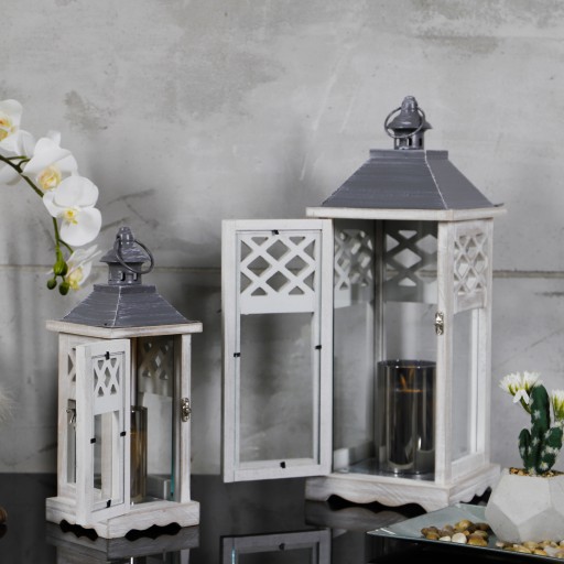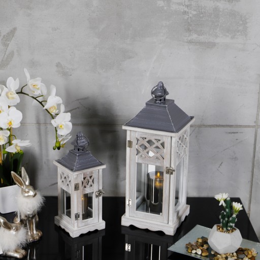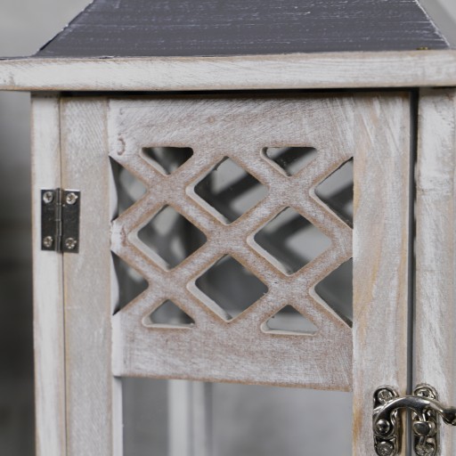 Korpus latarni wykonany został w całości z drewna w kolorze szarym przecieranym, a szybki wykonane są ze szkła o grubości ok 3mm.