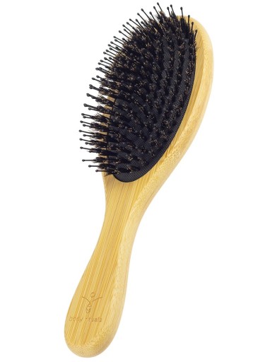 Duża, owalna szczotka z włosiem dzika i nylonowymi igiełkami z bambusową oprawą. Doskonała do rozczesywania długich i gęstych włosów. Szczotka z naturalnego włosia sprawi, że włosy pięknie się błyszczą oraz są niezwykle wygładzone oraz wyglądają na zdrowsze. Naturalne oleje oraz keratyna z włosia dzika rozprowadzane są na Twoich włosach zapewniając im gładkość i zdrowy wygląd. Podczas czesania domyka łuski, zabezpieczając włos przed uszkodzeniami i utratą wilgoci.