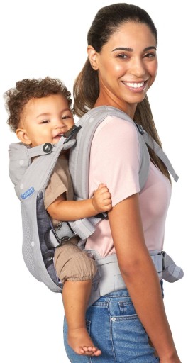 - Dziecko przodem na plecach rodziców - dla dzieci będących w stanie całkowicie samodzielnie siadać. W tej pozycji dziecko może sprawdzać co się dzieje dookoła, ale nadal wie, że rodzic jest tuż obok.