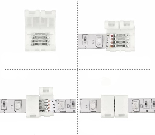 - Łatwe w montażu złącze do zasilania taśm wielokolorowych LED RGBW.