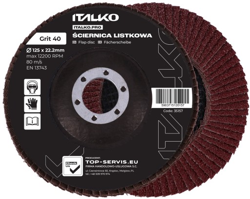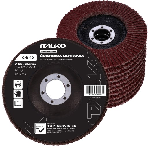 Tarcza listkowa marki ITALKO wykonana z lamelek z płótna z ziarnem korundowym na dysku z włókna szklanego.