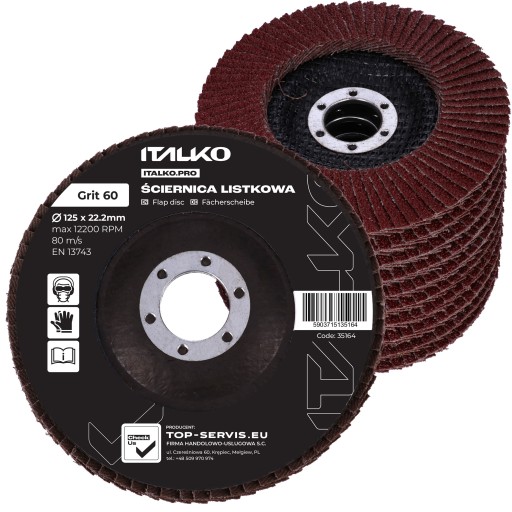 Tarcza listkowa marki ITALKO wykonana z lamelek z płótna z ziarnem korundowym na dysku z włókna szklanego.