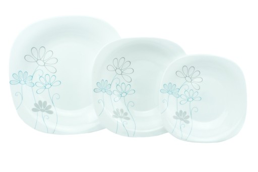 - Jedną z nich jest OLIWIA zestaw talerzy o kształcie kwadratowym, składający się z 18 elementów (talerze obiadowe do drugiego dania, talerze głębokie na zupę i talerze deserowe).