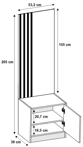 Wymiary szafki na buty z siedziskiem + panel z lamelami ozdobnymi.