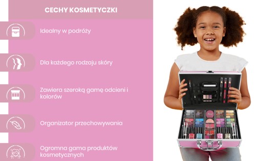- Co otrzymasz - Ta kosmetyczka zawiera kosmetyki i akcesoria od; cienie do powiek, rozświetlacze, szminki, róże, pędzle, ołówki, lakiery do paznokci, naklejki do zdobienia paznokci i nie tylko.