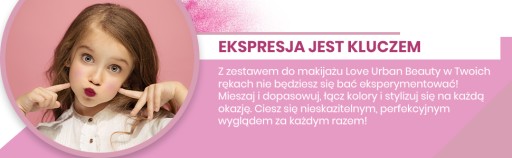 - Ekspresja jest najważniejsza - Z zestawem do makijażu Love Urban Beauty w Twoich rękach nie będziesz się bać eksperymentować! Mieszaj i dopasowuj, łącz kolory ze stylami na każdą okazję. Ciesz się nieskazitelnym, perfekcyjnym wyglądem za każdym razem!
