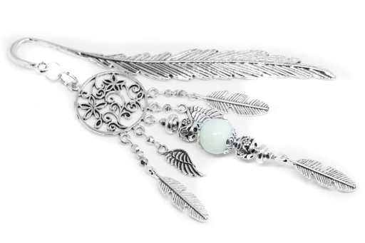 Elegancka zakładka do książki z zawieszką w kształcie łapacz snów z dodatkiem zielonego jadeitu oraz srebrnego hematytu.