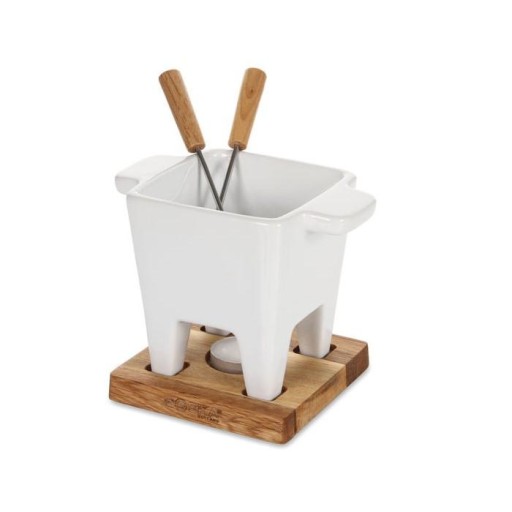 Zestaw ten to garnek ceramiczny o pojemności 200ml, dwa widelczyki, podstawka i podgrzewacz.
