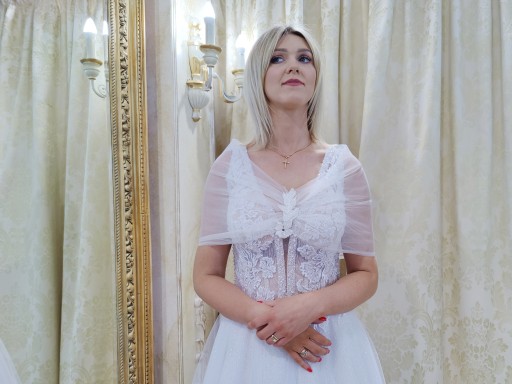 Szal tiulowy ecru, bolerko "motylek" z aplikacją koronkową.