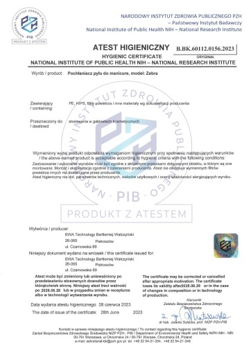 Pochłaniacz manicure Zebra jest nie tylko skutecznym narzędziem do usuwania pyłu, ale także gwarantuje wysoki poziom higieny. Posiada atest higieniczny PZH, który potwierdza jego bezpieczne i skuteczne działanie. Możesz być pewna, że wybierając nasz pochłaniacz, inwestujesz w produkt, który spełni najwyższe standardy higieny i zapewni bezpieczne środowisko pracy w Twoim salonie kosmetycznym.