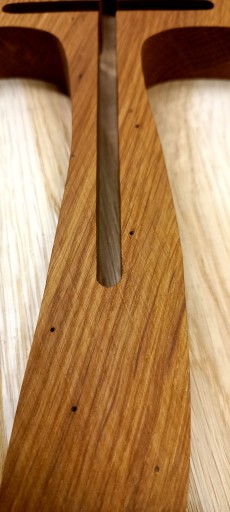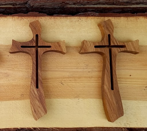 Ręcznie robiony krzyż - wycinany wyrzynarką włosową z drewna dębowego. Drewno ma charakter retro, rustykalny. Dopuszcza się sęki, dziurki po korniku.