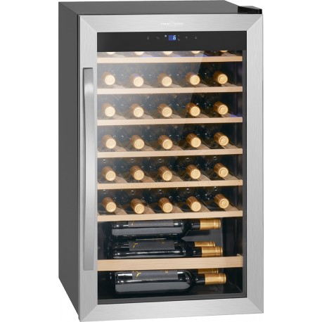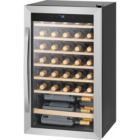 Duża chłodziarka do wina o pojemności całkowitej aż 95l i miejscem na 36 butelek 0.75 litra. Szklany, przezierny front, podświetlenie wnętrza oraz półki wykonane z drewna sprawiają, że jest ona doskonałym uzupełnieniem eleganckiej kuchni, pokoju hotelowego czy baru. Urządzenie posiada regulację temperatury chłodzeni w zakresie od +4 do +18°C