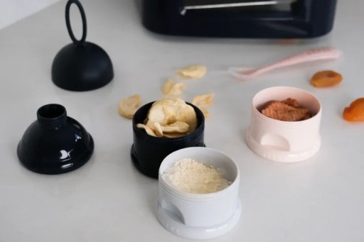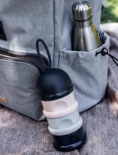 Pojemniczki nakręca się jeden na drugi, ale można ich także używać osobno, tj. 1 lub 2, w zależności od potrzeb. Górna nakładka z wąskim otworem ułatwia przesypanie mleka do butelki. Pokrywka ma ergonomiczny, zaokrąglony kształt i wygodny uchwyt do przenoszenia.