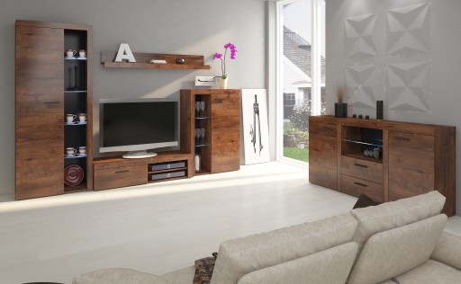 Meblościanka została wykonana z wysokiej jakości płyty meblowej laminowanej obustronnie, wykończonej obrzeżem ABS