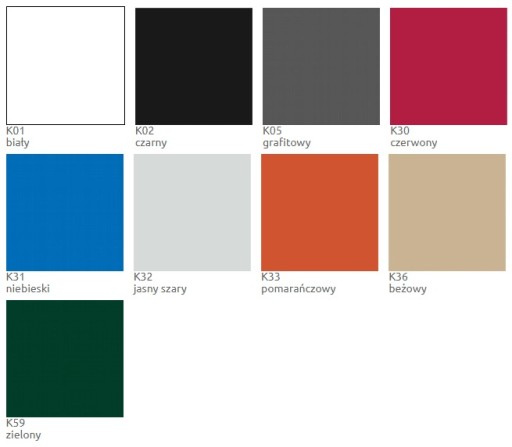 Krzesło dostępne w kilkunastu kolorach do wyboru. Lista dostępnych kolorów widoczna poniżej. Wybrany kolor proszę podać w informacji do sprzedającego.