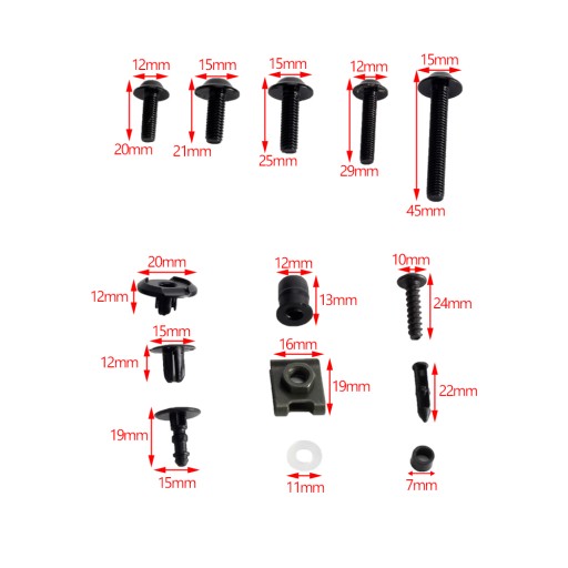 Komplet śrub i kołków do owiewek motocykli sportowych.