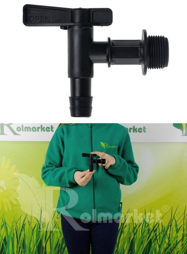 Łącznik z zaworem, na którym zamontowana jest wkrętka ( przyłącze) z szybkozłączką umożliwia podłączenie węża ogrodowego o średnicy 1/2" z pojemnikiem na wodę deszczową .