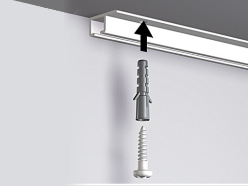 Do każdego koloru szyny oferujemy dedykowany zestaw montażowy, uwzględniający wybraną kolorystykę. Szyna o długości 2 metrów posiada 9 nawierconych otworów, za pomocą których bezpośrednio mocujemy ją do sufitu.