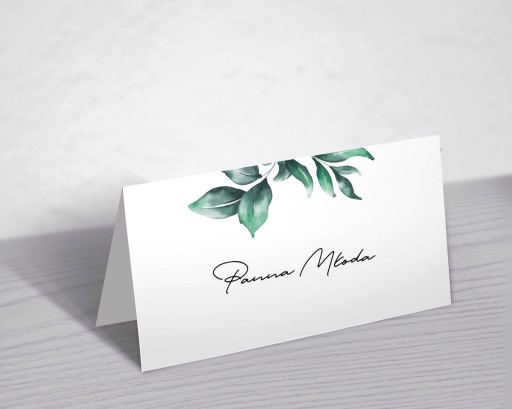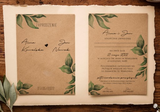 Zaproszenia ślubne (możliwa modyfikacja na treść na inną okazję- Chrzest, Komunię, urodziny itd.) Z zielonymi liśćmi, w stylu botanicznym, na wesele inspirowane naturą.