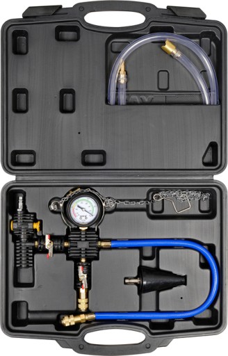 Eliminuje to konieczność odpowietrzania układu chłodzenia, skracając czas obsługi pojazdu. Zestaw zawiera manometr w gumowej osłonie, przewód doprowadzający płyn chłodniczy oraz stożek/reduktor o zakresie obsługiwanych średnic od 15 do 45 mm. Całość zapakowana w wytrzymałą walizkę.