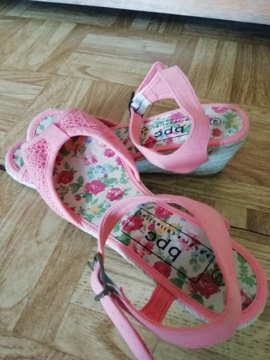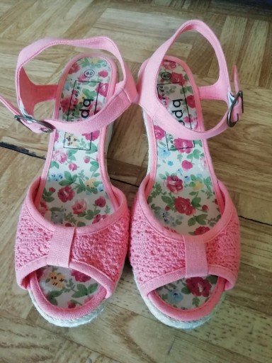 Sandały - espadryle w kolorze moreli, zapinane na sprzączkę. Wkładka w różyczki. Wygodny obcas. Ubrane tylko raz (do lekkiego odświeżenia).